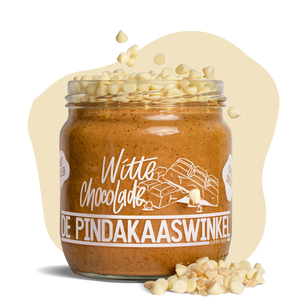 Onze witte chocolade is gemaakt van hoogwaardige cacaoboter gemaakt door onze vrienden in het zuiden, De Belgen, die maken de allerlekkerste, vinden wij. ;) We gebruiken stukjes chocolade zodat je de smaak echt tegenkomt. De romige cacaoboter is een perfecte combinatie met pindakaas omdat die van nature een wat drogere nasmaak geeft. Omdat er geen cacaomassa in witte chocolade zit, heeft het een mildere, romigere smaak dan donkere chocolade.